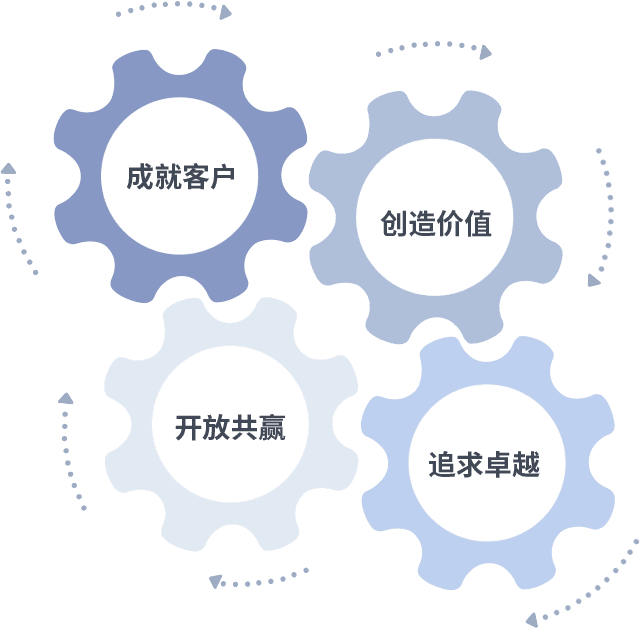 成就客户是一切决策的出发点,,,创造价值是衡量所有工作的标准,,,追求卓越是我们做事做人的态度,,开放共赢是我们的格局也是最终的结果。。。价值观的齿轮环环相扣,,,,推动着组织里的每个人不断向前。。。