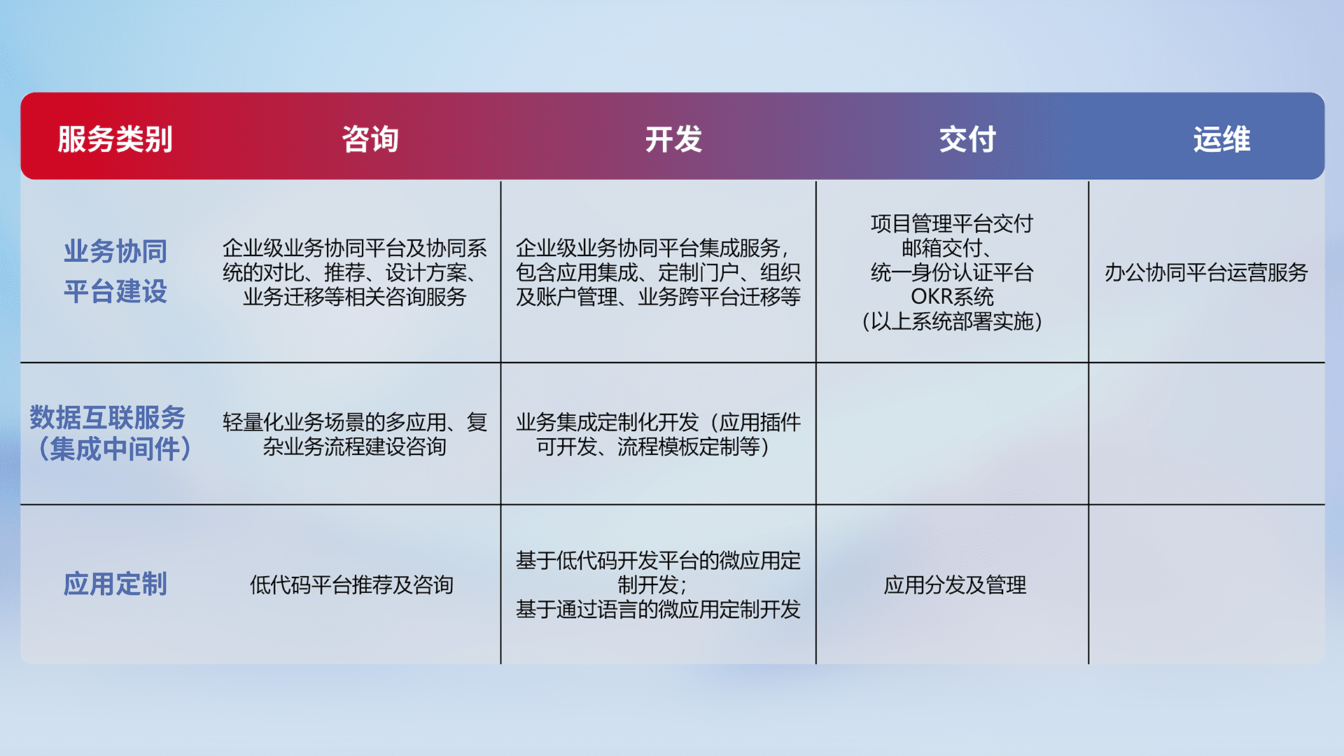 针对钉钉、、、企微、、、、IDaas等平台级产品提供产品的规划、、、、方案、、交付、、、、定制化开发等服务,,,,实现如统一协同办公、、智能客户服务、、、混合会议管理、、智能数据查询、、等业务场景,,,,实现数字化转型。。。
